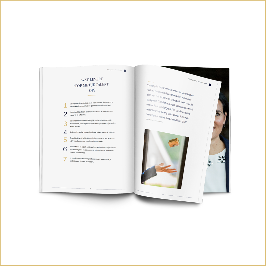 Samen met mijn team ontwikkelden we een nieuwe look and feel en rolden we haar design stap voor stap uit. Zo kreeg haar bedrijf onder andere: een nieuwe naam, beeldenbank, website, brochures, ebook, werkboeken, notitieboek, leiderschaps spel, social media design, vouchers en tickets.